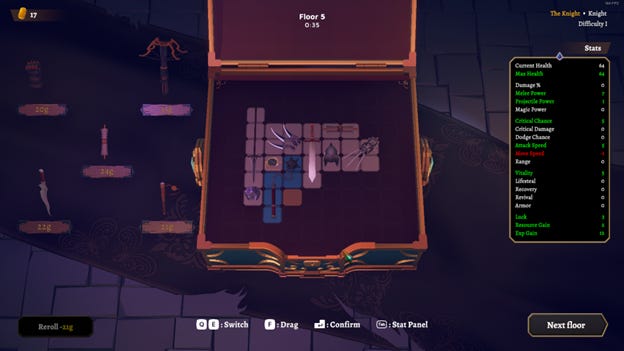 In God of Weapons, you venture through dungeons defeating and dodging monsters, and unlocking characters and weapons by completing different feats. What makes this game unique is the inventory system. While in other games you gain skills when you level up, in here, you gain inventory space.